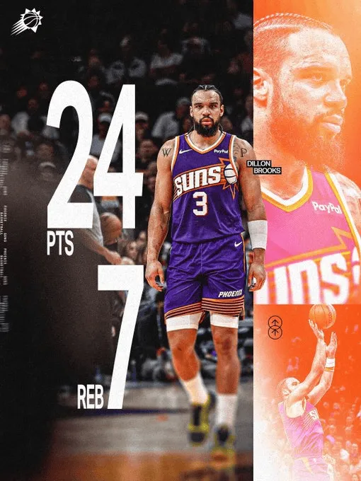 本场竞赛,太阳队球员狄龙-布鲁克斯进场33分钟,投篮23中10,其间三分球9中4,得到24分7篮板2助攻1抢断。